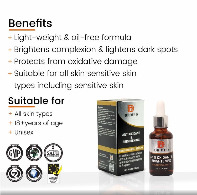 Description Experience the radiance-boosting power of our Brightening Serum, formulated with a potent blend of nature’s best ingredients. Enriched with Liquorice root powder, Mulberry fruit powder, Grape leaf powder, and more, this serum is designed to unveil your skin’s natural luminosity. Transform your complexion and embrace a more radiant you with each use. Key Features: – Brightening Formula: Enhances overall skin radiance for a vibrant and healthy appearance. – Dark Spot Reduction: Targets hyperpigmentation and diminishes the visibility of dark spots. – Even Skin Tone: Balances skin coloration, promoting a uniform and consistent complexion. Volume: 30ml Ingredients: Liquorice root powder Mulberry fruit powder Grape leaf powder Bearberry leaf extract Wheat protein Black bearberry extract Sea weeds powder (Hyaluronic Acid)*: Maintains Moisture Balance, Hydrating and Plumping the Skin. **How to Use:** Apply DR MED Brightening Serum for a radiant glow. Cleanse face, then gently massage a small amount in upward motions. Use daily as part of your skincare routine to unveil natural luminosity.