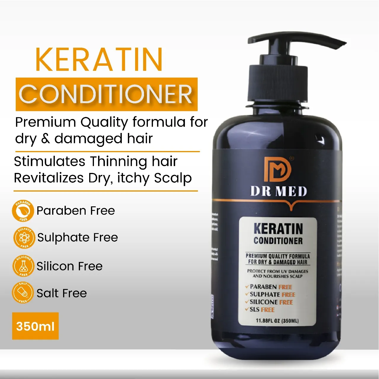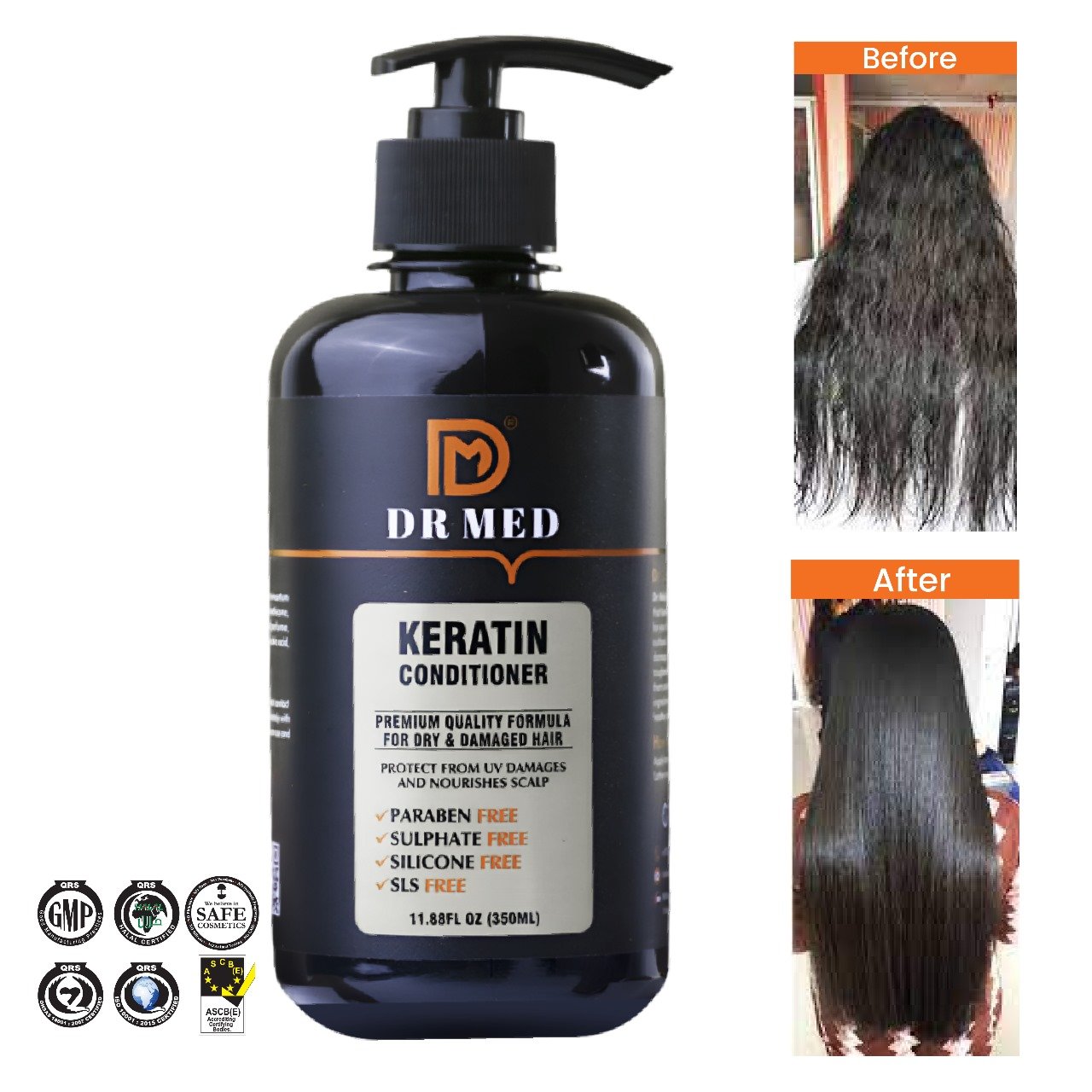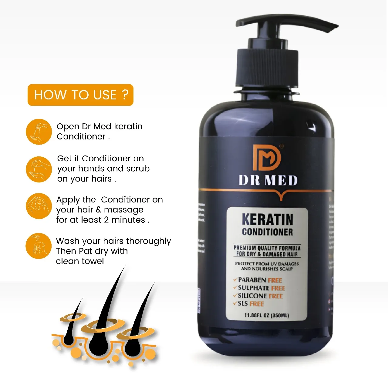 - Apply Conditioner: Take a sufficient amount of the DR MED Keratin Infused Conditioner and apply it evenly from mid-length to the ends of your hair, avoiding the scalp.