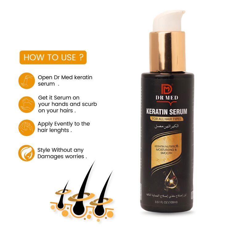 DR MED Keratin Hair Serum is likely formulated to provide nutrition, moisture, and smoothness to your hair. Keratin is a protein that is naturally present in hair, and keratin serums are designed to replenish and strengthen the hair, reducing frizz and promoting a smoother, healthier appearance.
