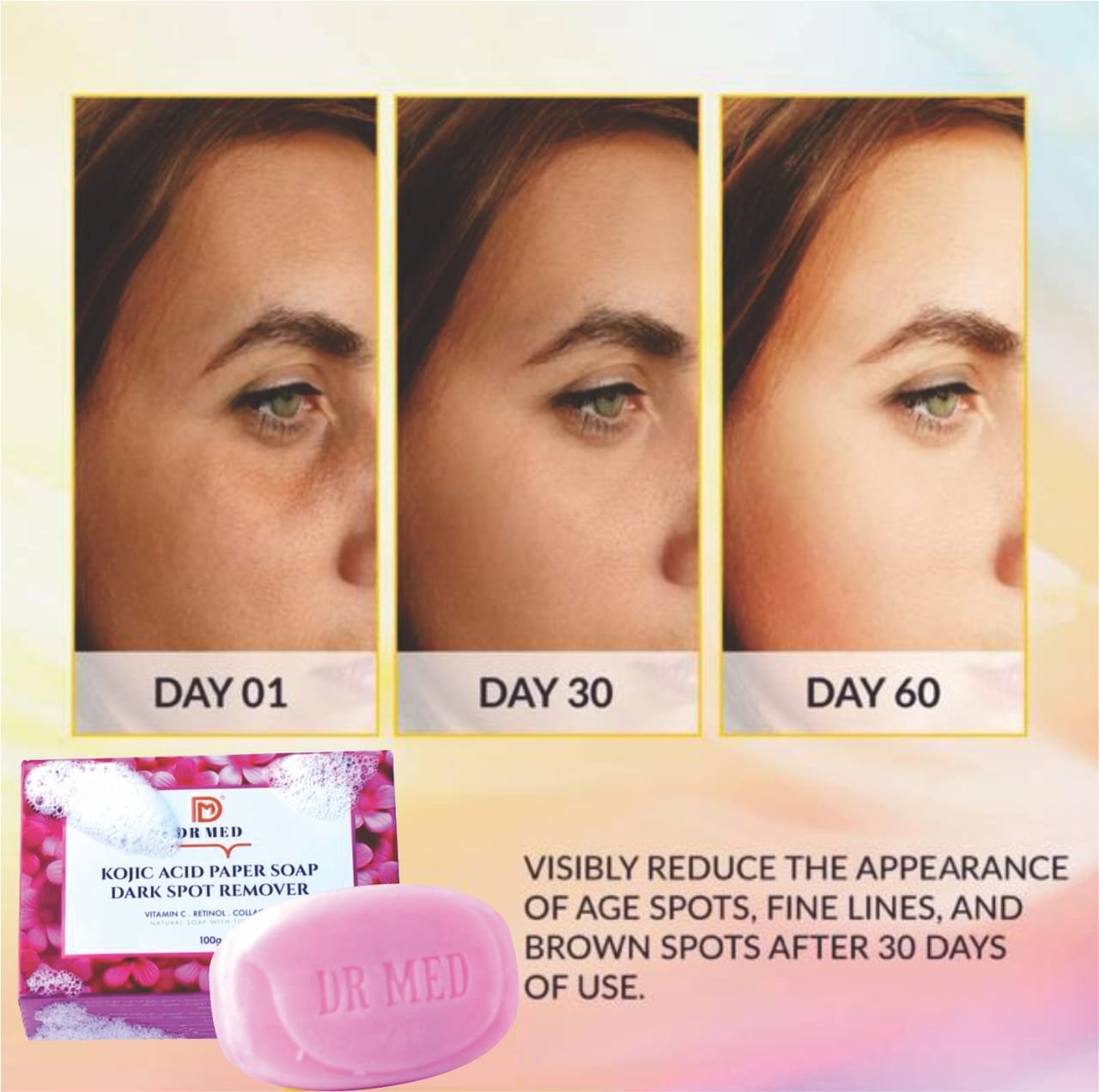 DR MED Kojic Acid Paper Soap Dark Spot Remover in a 100g size is a skincare product formulated to specifically target dark spots and hyperpigmentation issues.