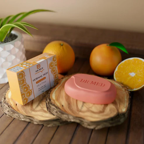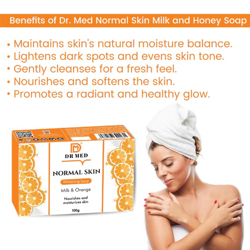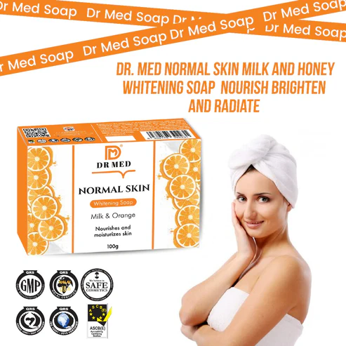 DR MED Normal Whitening Skin Soap with Milk & Orange, in a 100g size, is a skincare product designed for regular skin types, aiming to provide both nourishment and potential brightening effects.