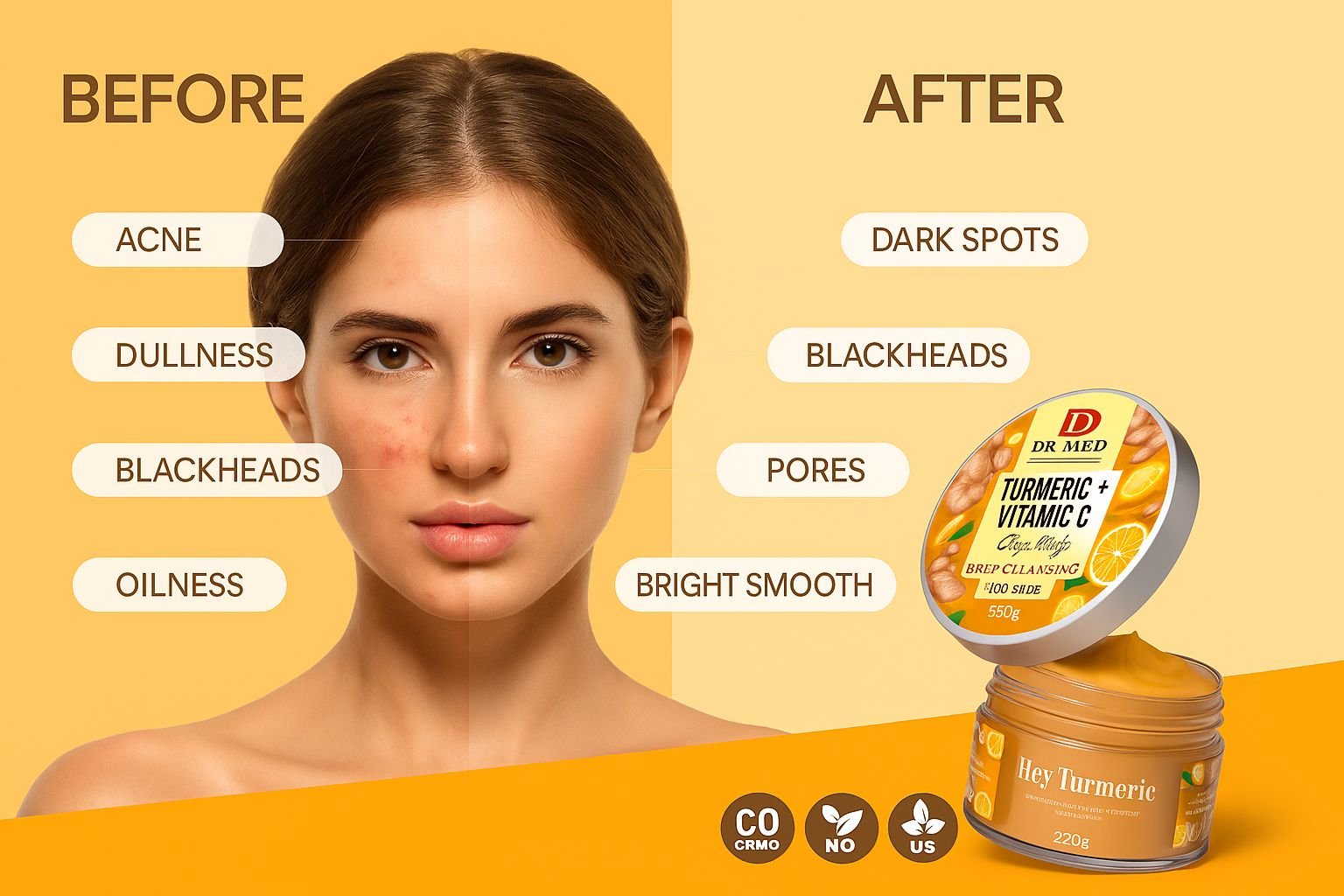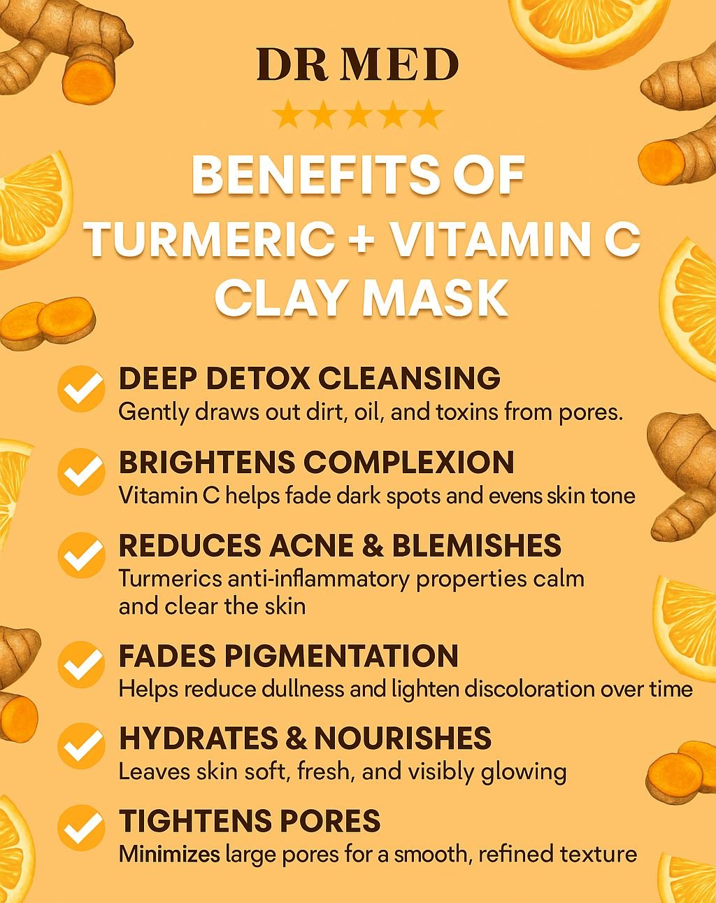 Reveal your skin’s natural radiance with DR MED’s Turmeric + Vitamin C Clay Mask – a powerful blend of brightening and anti-inflammatory ingredients. This deep cleansing face mask is enriched with Turmeric to reduce blemishes and even out skin tone, while Vitamin C works to fade dark spots, improve complexion, and restore a healthy glow. The rich clay base draws out impurities, controls excess oil, and refreshes dull, tired skin – making it perfect for daily or weekly detox skincare routines. Suitable for all skin types, especially blemish-prone and uneven skin tone.